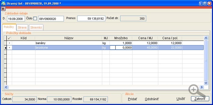 Automaticky sa pridajú všetky suroviny, ktoré sú podľa receptu nutné na navarenie tohto jedla. V stĺpci Mn. strava je zobrazené množstvo suroviny, ktoré je nutné spotrebovať a v stĺpci Množstvo je zobrazené skutočné množstvo, ktoré bude odpísané zo skladu. V prípade, že potrebné množstvo suroviny (Mn. strava) je väčšie ako disponibilné množstvo na sklade (Množstvo) je táto položka zobrazená červeným písmom. Stravný list, ktorý obsahuje takéto "červené" položky, nie je uložiť.