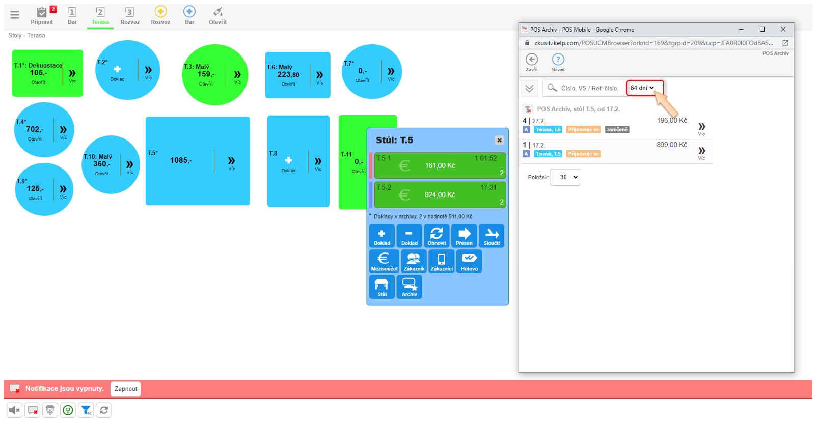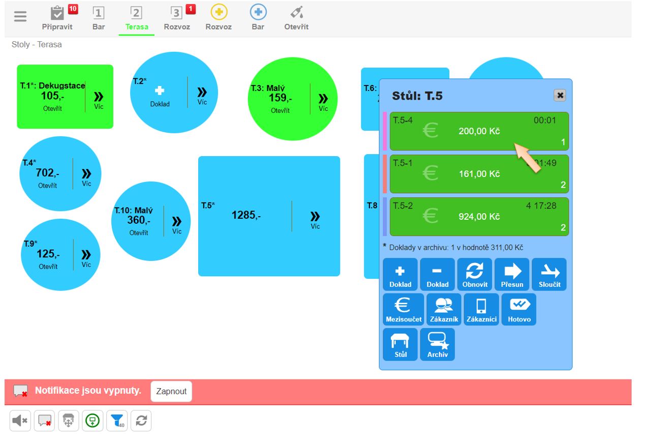Objednávky, ktoré boli presunuté do archívu sa zobrazujú na jednotlivých stoloch symbolom *. V histórii dokladov je ale možné si zobraziť všetky tieto objednávky.