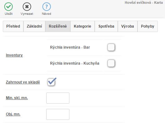 Inventury - skladovou kartu je možné zařadit do skupiny pro tzv. "Rychlou inventuru". Při výběru tohoto typu inventury, se do nové inventury automaticky přidají položky zadefinované do příslušné skupiny. Do jednotlivých skupin rychlé inventury je vhodné zadávat položky, které je potřebné často inventurovat, např. při výměně směn.