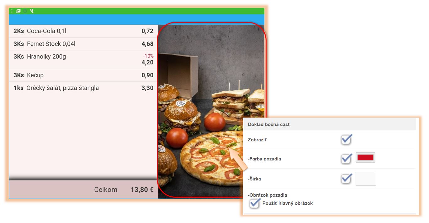 - Obrázok pozadia - obrázok pozadia, ktorý sa bude zobrazovať pri účtovaní. Obrazovka na účtovanie je rozdelená pri účtovaní na časť pre položky a časť pre obrázok. Vhodné pri zariadeniach s väčšou šírkou displeja.