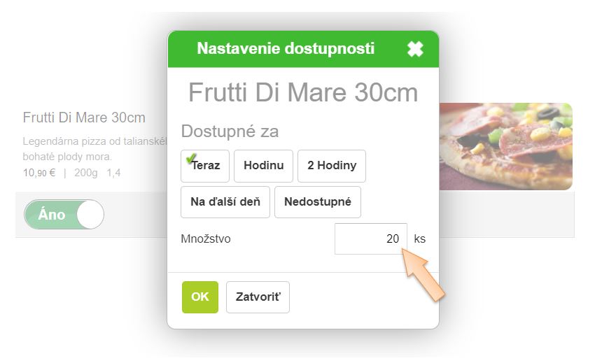 Dostupnosť sa nastavuje ako hodnota dostupných položiek pre objednávanie a každým predajom sa počet znižuje. V prípade, že počet dostupných položiek klesne na 0, položka automaticky bude nedostupná pre objednávanie. Nakoľko táto dostupnosť nie je závislá od skladovej evidencie, je potrebné ručne opätovne zadať počet dostupných položiek manuálne, čím sa položka opätovne stane dostupnou. (Počet dostpupných položiek je vhodné nastaviť podľa reálne dostupného množstva tovaru na prevádzke.)