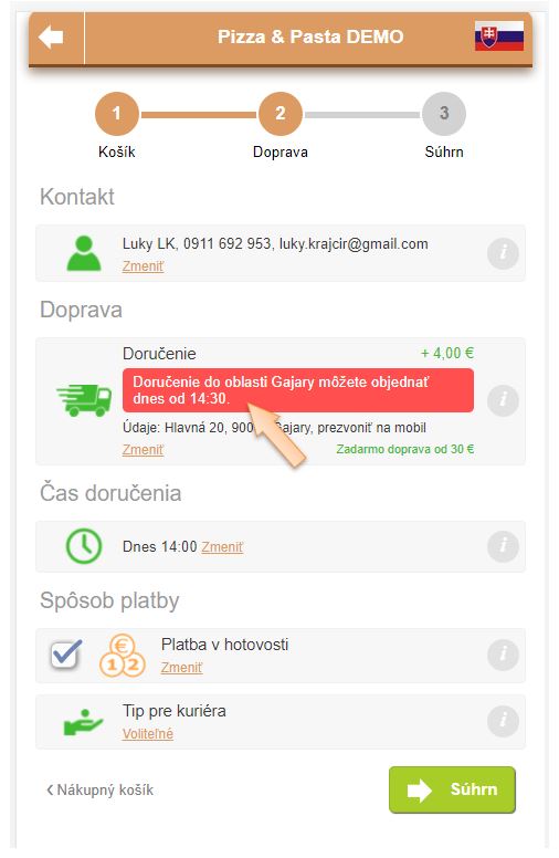 - Práve časom podľa druhu doručovania je vhodné definovať, od kedy začínate doručovať. Ak je na rozvoze nastavené, že doručovanie je od 10:00 (tu už sa jedná o čas, kedy bude objednávka skutočne doručovaná, nie len kedy kuriér sadá do auta) a zákazník si spraví objednávku 8:20, systém ho informuje, že najskôr mu bude objednávka doručená 10:00.