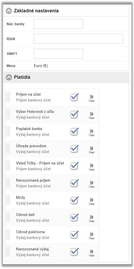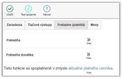 - Pokladne (platidlá) - definovanie jednotlivých platidiel pre danú pokladňu, aké platidlá má systém ponúkať pri platbe, či sa v danej pokladni používa aj prepojený platobný terminál a pod.