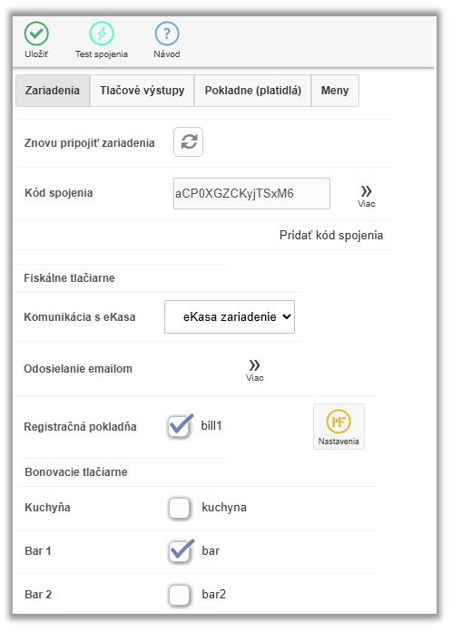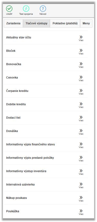 Pre jednotlivé zariadenia nakonfigurované v aplikácii, je možné podľa ich funkčného významu v aplikácii nadefinovať, čo sa má na výstupe tlačiť. Rozšírené nastavenia pre jednotlivé výstupy sa zobrazia po kliknutí na tlačidlo Viac pri danom výstupe. Bližší popis jednotlivých výstupov a popis možných nastavení sa dozviete v článku Nastavenia výstupov zariadení v iKelp POS Mobile.