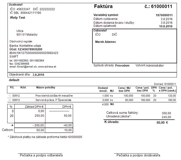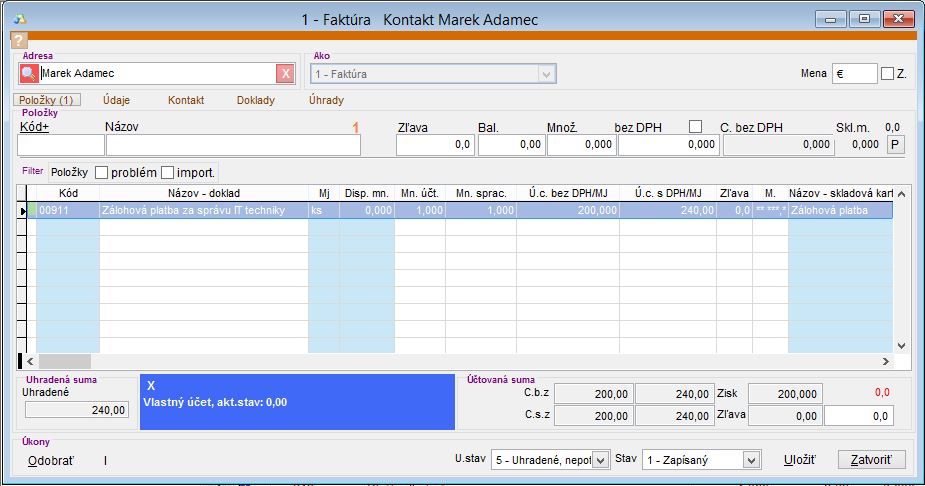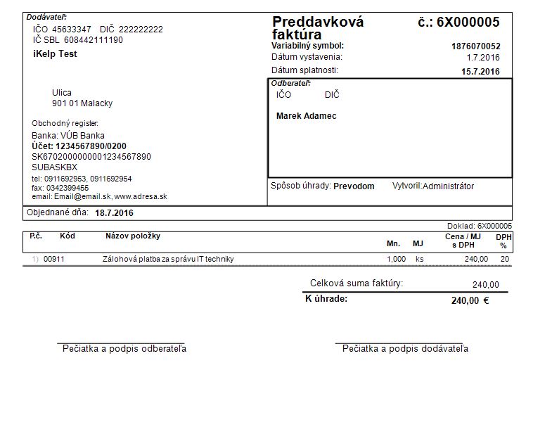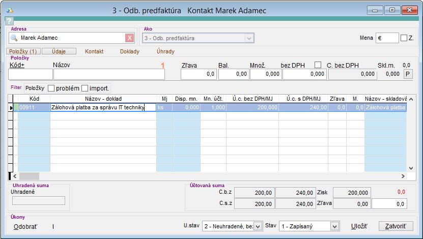 Zálohová faktúra len definuje, čo sa má zaplatiť, slúži ako výzva k úhrade. (Nemá rozpis DPH, na doklade je suma, ktorú má zákazník uhradiť.) Na doklade bude účtovaná položka - Zálohová platba za xxx (za xxx doplňte bližšiu špecifikáciu o tom, na čo je záloha určená).
