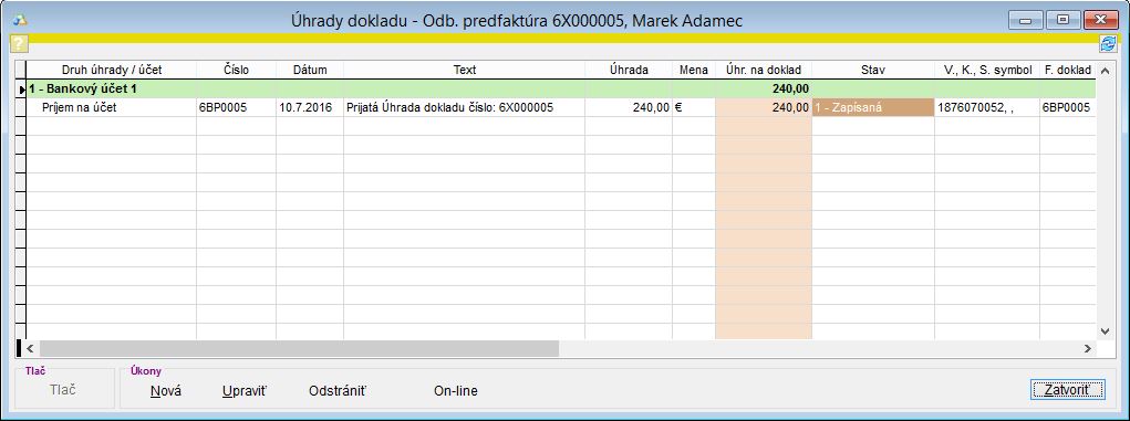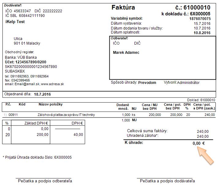 Po pripísaní úhrady na účet sa zo zálohovej faktúry sa vytvorí cez väzbu vyúčtovacia faktúra, na ktorej je už rozpis DPH a vyúčtované položky zo zálohovej faktúry. Na základe tohto dokladu dochádza k odvodu DPH, pričom suma na úhradu je na doklade nulová.