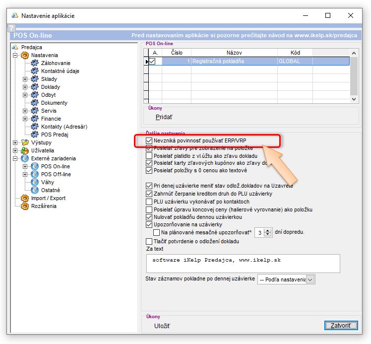 - Aktivujte možnosť Účtenka, bez ERP / VRP.