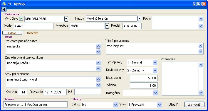 Po prepnutí do záložky Zariadenie môžete upraviť niektoré textové polia, prípadne môžete zmeniť adresu dodávateľa. Prepínaním do ďalších záložiek môžete vypĺňať ďalšie informácie o oprave. Napríklad v záložke Údaje môžete zadať pretext a zatext k tlačenému dokladu opravy.
