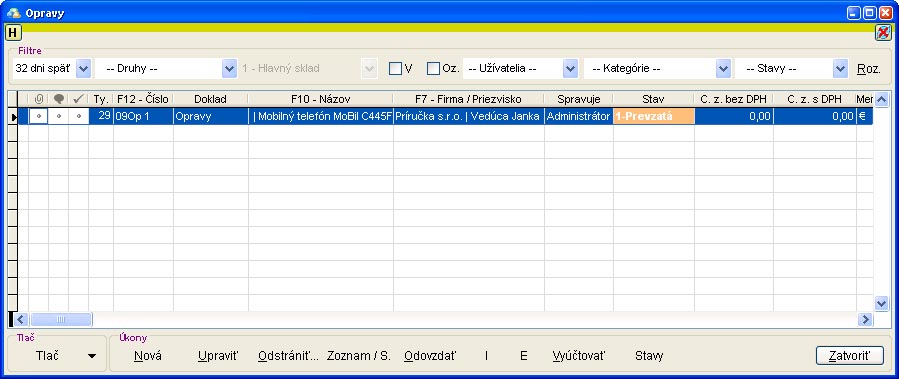 V spodnej časti úkonov je možné zmeniť stav danej opravy a následne nezabudnite danú opravu uložiť.